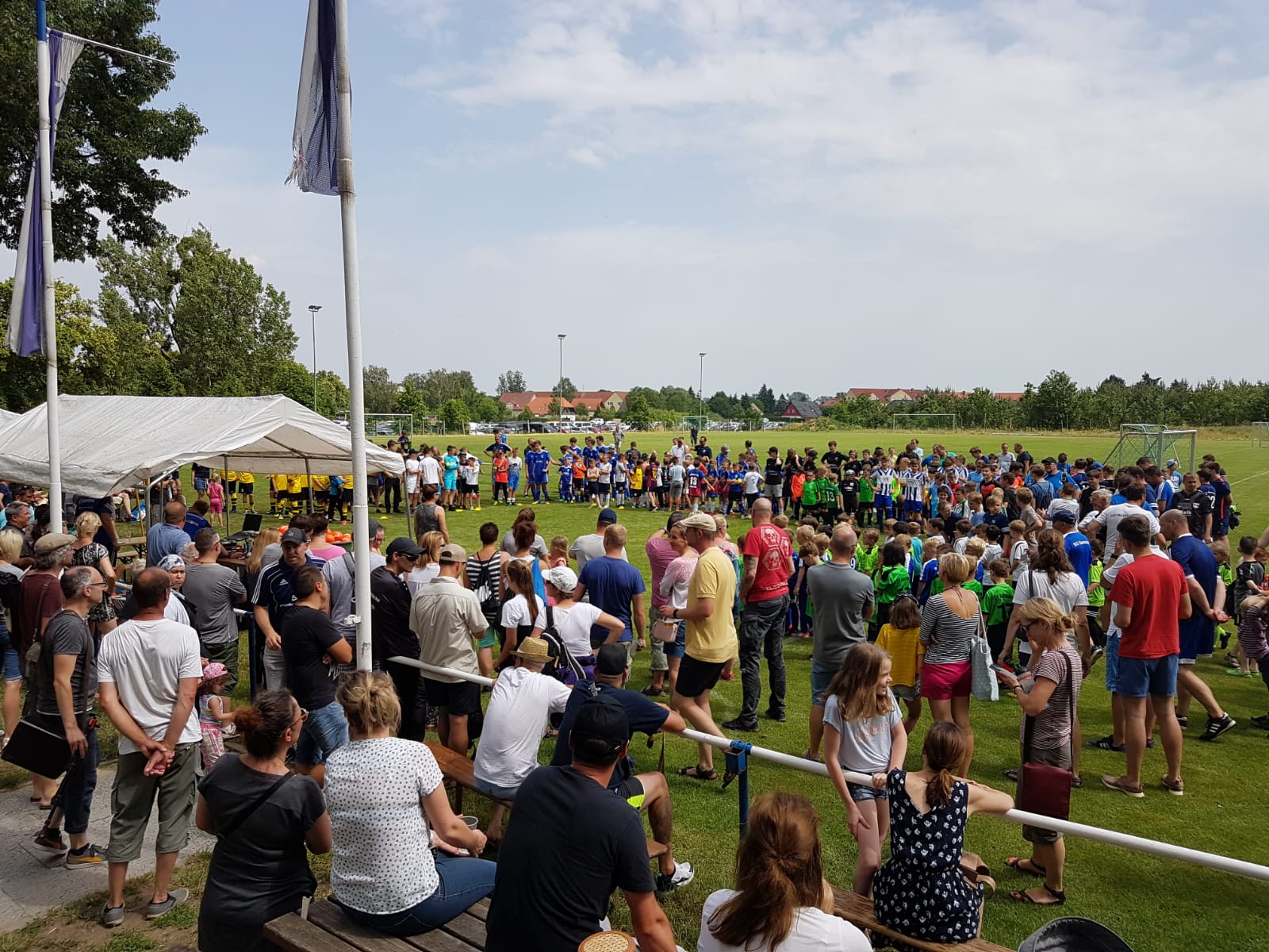 Bei strahlendem Sonnenschein und hochsommerlichen Temperaturen fanden sich 30 Nachwuchsmannschaften der Region am Samstag, den 15. Juni 2019 um 10 Uhr auf dem Sportplatz der SG Saarmund am Saarmunder Berg ein. Die SG Saarmund hatte zum DNS-NET-Nachwuchsturnier eingeladen, nach 2017 und 2018 damit schon zum dritten Mal. Und die über 300 Kinder, Trainer, Betreuer und die vielen mitgereisten Eltern staunten nicht schlecht: vor ihnen lagen zwei topgepflegte Rasenplätze, die den Vergleich mit dem Rasen des Berliner Olympiastadions nicht scheuen mussten. Die ehrenamtlichen Helfer der SG Saarmund, die sich um die Rasenpflege mit viel Leidenschaft und noch mehr Stunden kümmern, hatten ganze Arbeit geleistet. Auch für die Verpflegung der Nachwuchskicker war alles vorbereitet: der Kuchenstand hatte über 20 leckere Kuchen zur Auswahl, auf den Grills brutzelten die ersten Steaks und Bratwürste und der Getränkestand hatte für Klein und Groß das passende Getränk schon bereitgestellt. Nicht zuletzt stand DJ Netto an den Reglern, um für die musikalische Untermalung des Events zu sorgen. Es war also alles perfekt vorbereitet für das 3. DNS-NET-Nachwuchs-Sommerturnier der SG Saarmund.