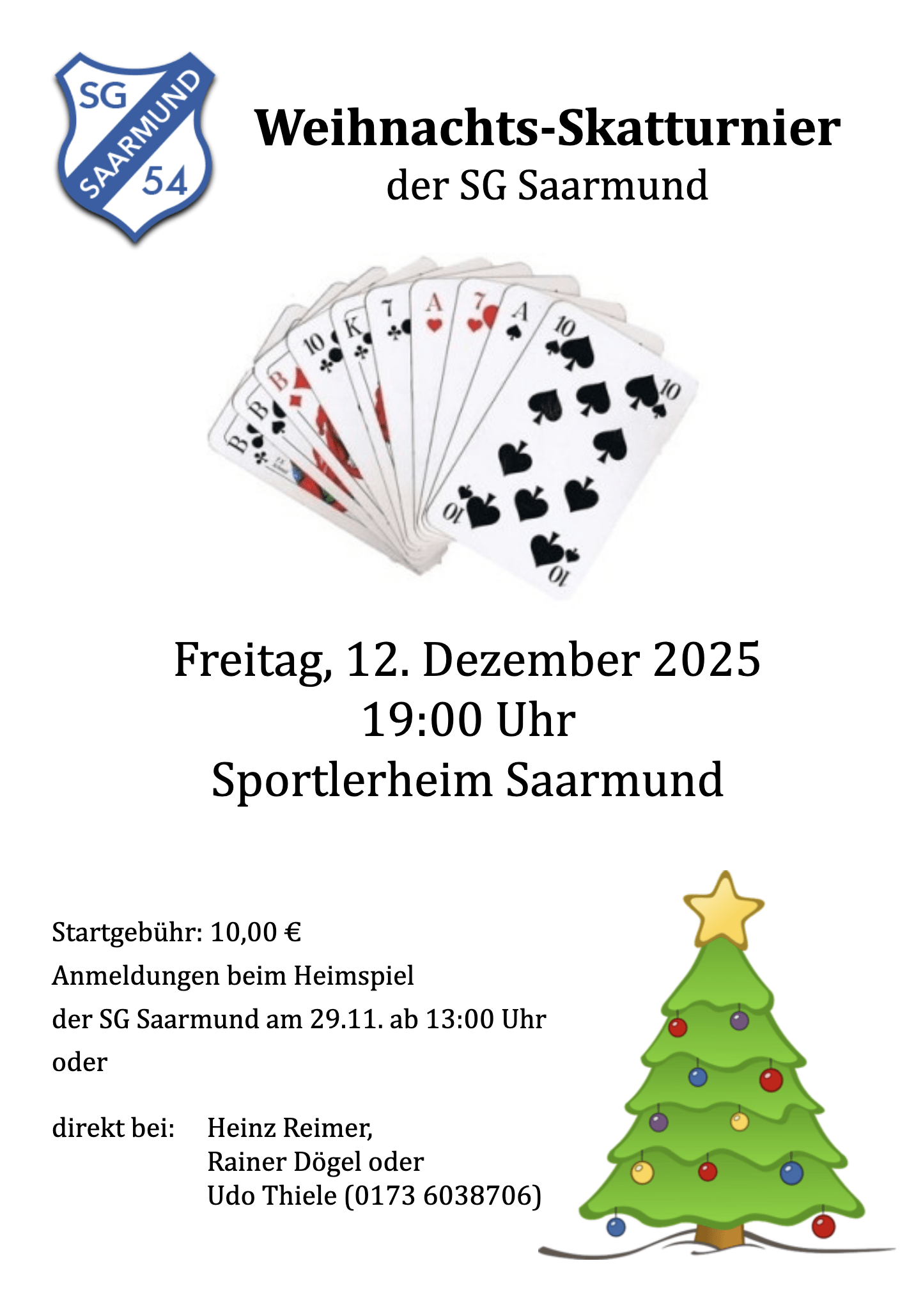 Am 12.12.2025 findet wieder das Weihnachtsskatturnier der SG Saarmund im Sportlerheim Saarmund statt. Beginn ist um 19 Uhr. Die Startgebühr beträgt 10,- €. Die Anmeldung erfolgt direkt bei Heinz Reimer, Rainer Dögel oder Udo Thiele unter 0173 6038706.